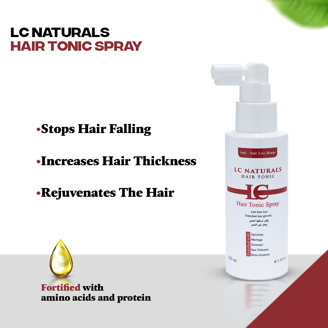Formula rich in Ginkgo biloba, Panax Ginseng and L – Arginine which improves effectively scalp micro circulation and increase growth rate of hair follicles. LC Naturals hair Spray Reinforced with phytosterols and Saw Palmetto to control negative effect of Dihydrotestosterone and improve hair growth. LC Naturals Hair spray rich in Spirulina and Moringa which nourishes and strengthens hair efficiently.